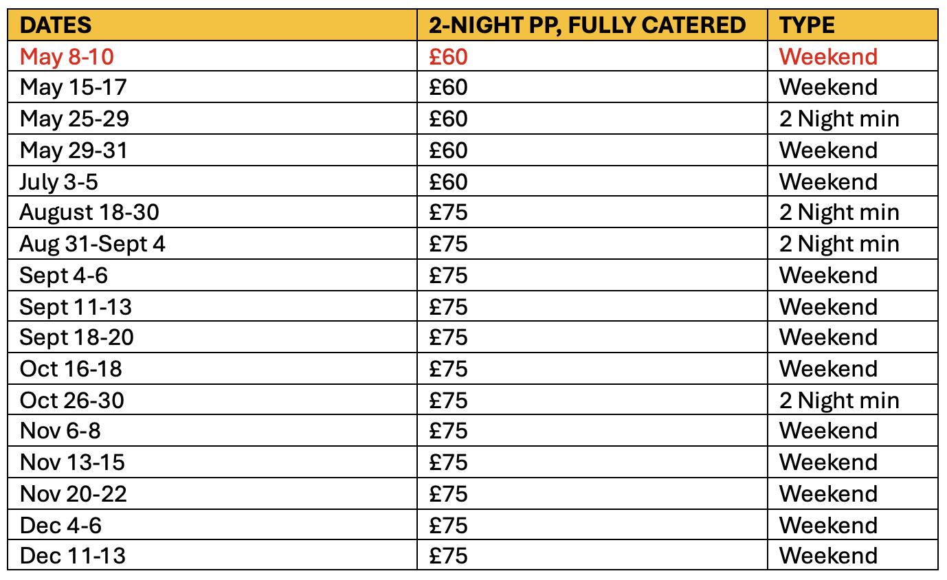 All prices include breakfast, use of the grounds, chapel, games room, and lounges